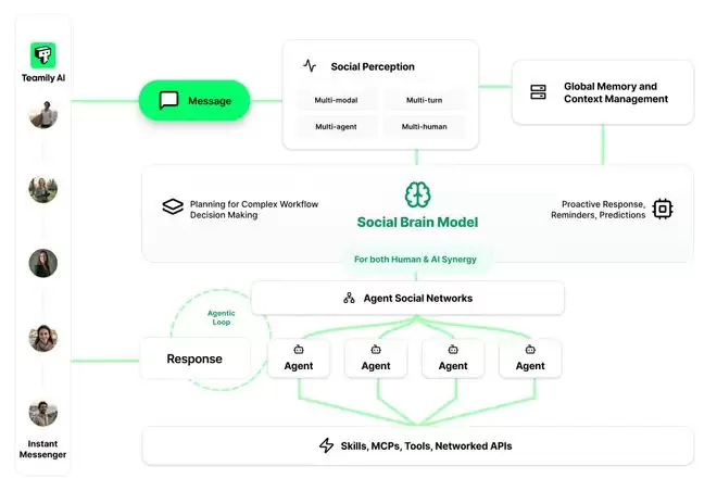 多模态感知层:系统将视频、音乐、图片、链接等富媒体内容,统一转化为文本进行理解。面对群聊中海量的历史记录,Teamily AI 采用了多级搜索与压缩技术,有效解决长上下文的记忆难题,确保 AI 不会「聊着聊着就忘了」。社交大脑:作为系统的决策中枢,它具备多任务规划能力。通过精准的意图识别与目标分解,社交大脑能够智能决策「现在谁该说话」以及「该调用哪个 Agent」。智能体网络:这是系统的执行层不仅能调度 AI Agent,还能调度人类。例如在会议结束后,社交大脑会合理分配任务:既安排 AI 去调研数据,也提醒人类去线下沟通,真正实现人机混合编排。