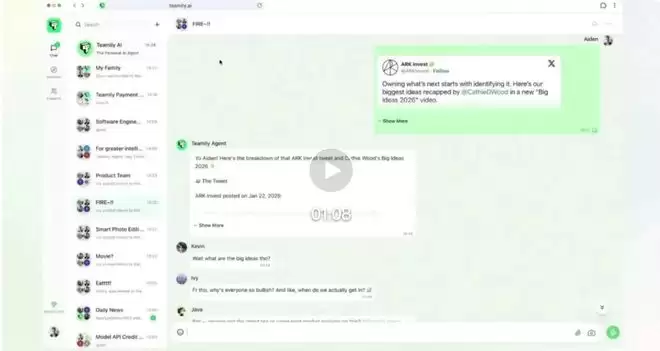 在这种设想下,Teamily AI 意识到,即时通讯应用(IM)是承载这一结构的最佳归属地,形成自然的人类 —AI 协作形式。因为群聊本身就是高频协作发生的空间,是信息自然流动的载体,而 AI 要成为「成员」之一,就必须进入对话里,而不是悬浮在界面之外。