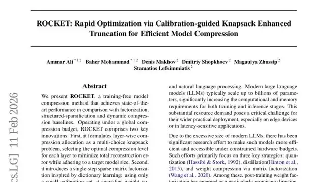 来自俄罗斯圣彼得堡ITMO大学和莫斯科MWS AI的联合研究团队在2026年2月发表了一项突破性研究成果,论文标题为《ROCKET: Rapid Optimization via Calibration-guided Knapsack Enhanced Truncation for Efficient Model Compression》。这项研究如同为庞大的AI模型找到了一位技艺精湛的"瘦身师傅",能够在保持模型智能的同时大幅减少其存储和运算需求。