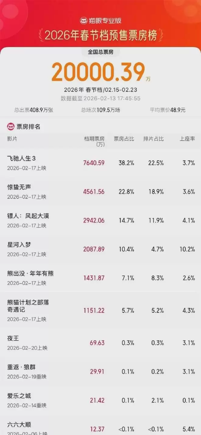 到2月13号的时候,《飞驰人生3》的预售已经超过7600万,牢牢地排在春节档第一,这数据并不是吹出来的,是观众用真金白银投出来的票。