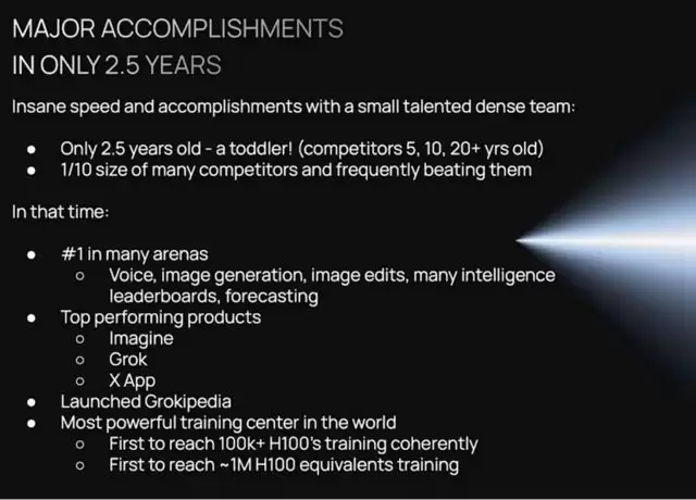 他先调侃xAI只有两年半,“还只是个学步的孩子”,随后一页页翻出公司成绩单:语音、图像、视频生成登顶榜单,10万张H100训练集群已经建成,百万卡规模在路上,Grok应用、Imagine、多模态产品线全面铺开。