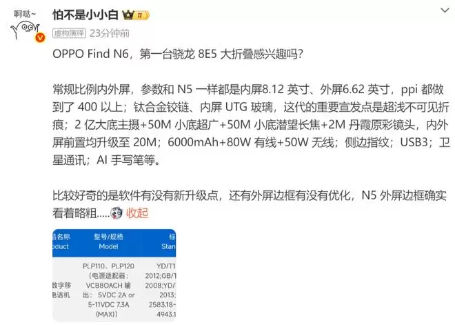 然后是核心配置方面的消息,据说会搭载骁龙8E5芯片的加入,意味着OPPO Find N6将成为性能最强的大折叠之一。
