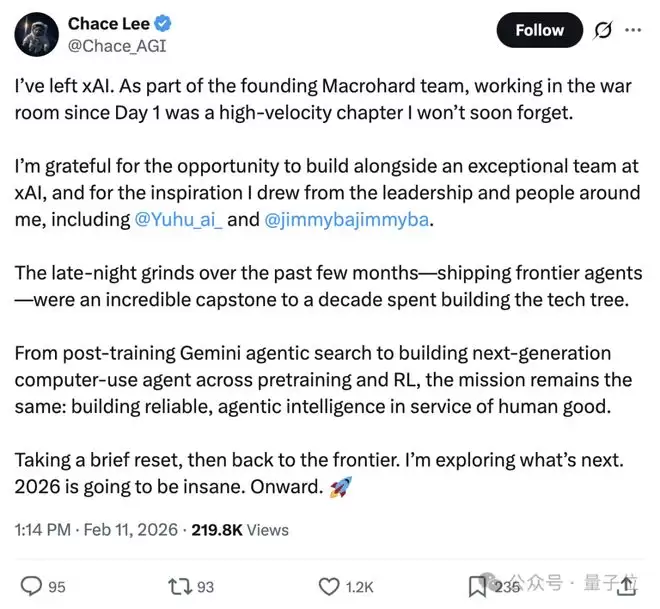 几个小时后,xAI旗下AI软件项目Macrohard创始团队成员Chace Lee也对外宣布离职。