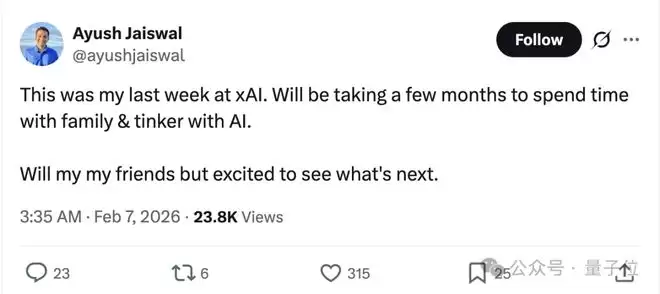 2月7号:xAI工程师Ayush Jaiswal宣布离职,表示准备暂时回归家庭。