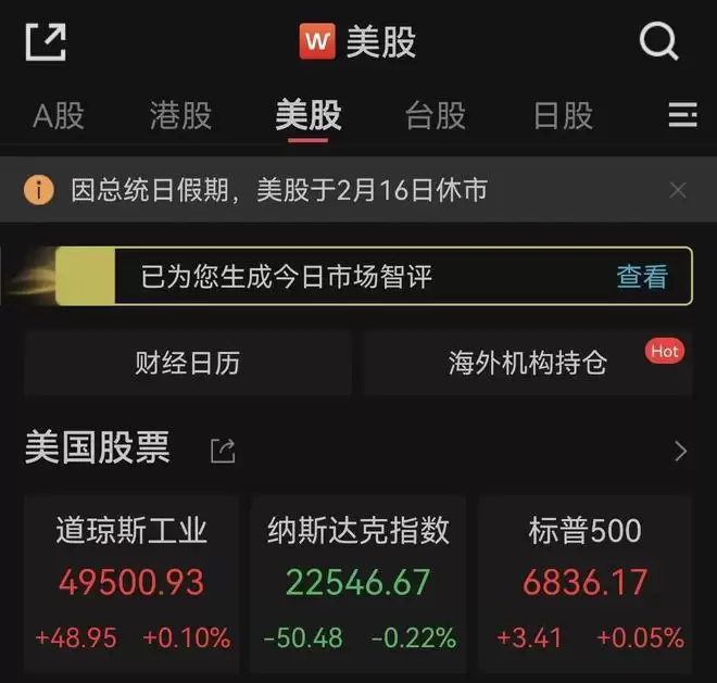 中新经纬2月14日电 美东时间周五,美国三大股指收盘涨跌不一。截至收盘,道指微涨0.1%至49500.93点,标普500指数小幅上扬0.05%至6836.17点,纳指则下跌0.22%至22546.67点。本周整体表现来看,道指累计下跌1.23%,标普500指数下跌1.39%,纳指跌幅达到2.1%。