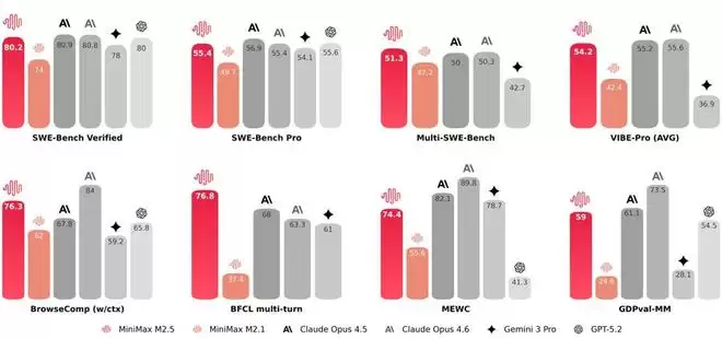 在编程最硬核的SWE-Bench Verified榜单上,M2.5拿到了80.2%的高分,与Claude Opus 4.6仅有微弱差距。在多语言任务Multi-SWE-Bench上,M2.5超越Claude Opus 4.6拿到第一。