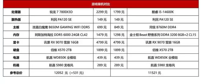 从装机总价来看,锐龙7 7800X3D配置的价格是要贵了531元,不过要考虑到这两套配置的价格都在万元以上,成本提升幅度不过4.6%,基本可以说两套配置处于同一价位。那么这两套价格相近的配置性能差别有多大呢?