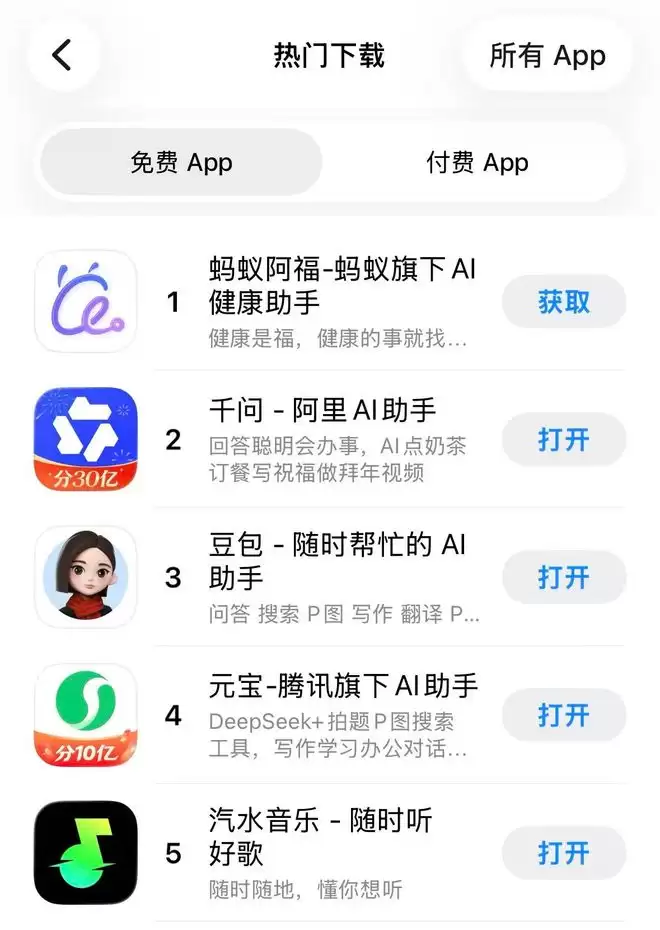 2月14日,苹果App Store中国区免费应用排行榜显示,蚂蚁阿福与千问的下载量出现显著增长,双双跻身总榜前两位。其中,蚂蚁阿福更是荣登苹果应用总榜下载量榜首。