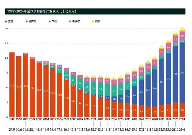 根据IFPI《2025全球音乐报告》数据显示,流媒体总收入达204亿美元,同比增长7.3%,相较于2024年(23%)、2024年(11%)、2024年(9.8%)逐步放缓;同时,作为营收支柱的付费订阅流媒体收入同比增长9.5%,较2024年的11.2%下降近2个百分点。这也导致,全球录制音乐总收入增速从2024年的10.2%骤降至2024年的4.8%,增速腰斩,创下2015年以来的最低年增长率,意味着流媒体正在进入明显的平台期。