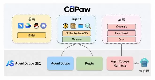 CoPaw 由 AgentScope 团队基于其生态,通过“多频道对话网关 + HTTP Agent 接口 + 可插拔 Skills”进行构建。