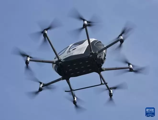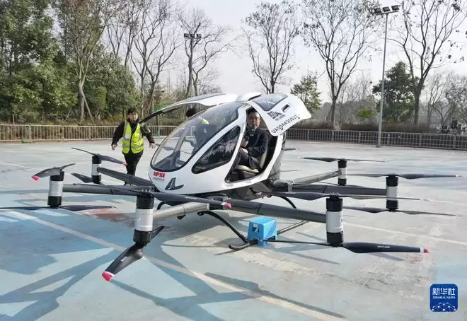 2月13日,四川省低空经济产业发展有限公司董事长龙志宇搭乘公司自主研发的eVTOL飞行器,在成都锦江区"智飞中心"完成验证飞行。这架电动垂直起降飞行器升空后,在80米高度稳定悬停十分钟,最终平稳降落。此次飞行实现了超大城市主城区首次eVTOL载人验证飞行的突破。新华社记者 刘坤 摄