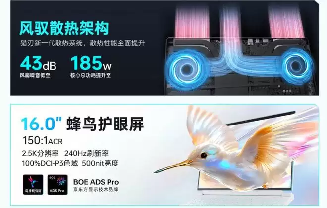 配备16英寸2.5K护眼电竞屏,240Hz高刷新率搭配500nit峰值亮度,画面清晰度与流畅度兼具,同时搭载ACR抗反光技术,可有效减少环境光线反射,即便在强光环境下玩游戏,屏幕画面也能保持清晰,避免反光影响游戏操作;散热升级为风驭散热系统,采用双涡流内循环架构,搭配导流鳍片、叠加式3D铜管与相变导热凝胶,散热效率大幅提升,全程无降频现象,能稳定支撑3A大作长时间满画质运行。