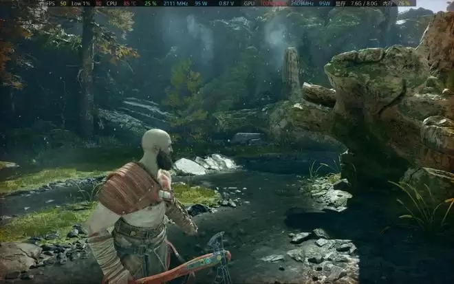 《战神4》没有基准测试程序,采用的是手动跑图测试,8060S帧速在55fps左右,RTX 4060是58fps;RTX 3060是54fps。从上面的截图大家也可以看到,双核心的总功率是95W,核显占用率基本100%,但CPU的频率较低,仅有2.1GHz——CPU频率对帧速拖了后腿。