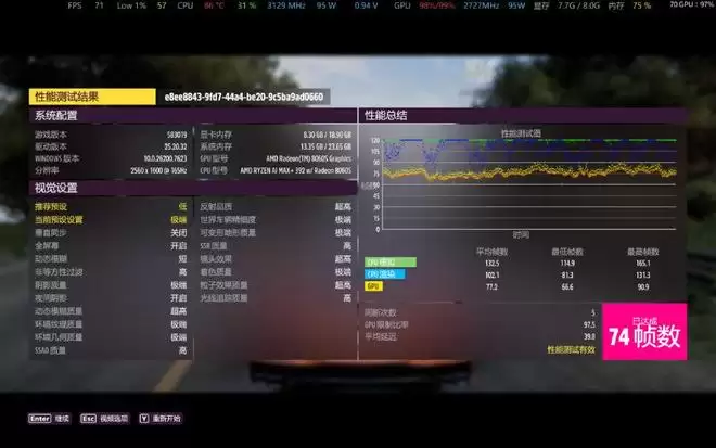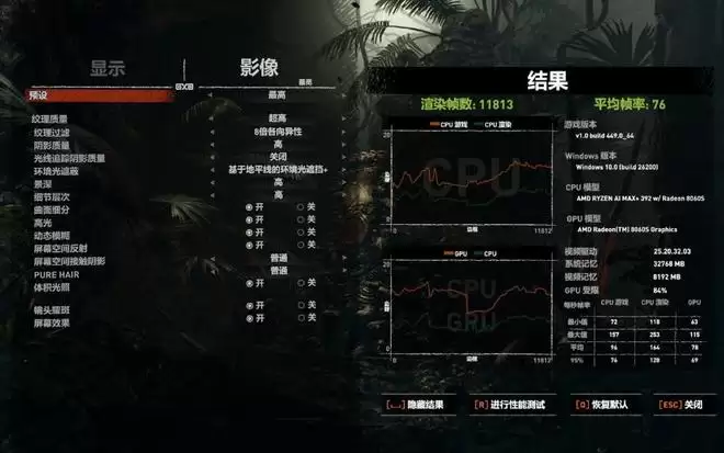 《古墓丽影:暗影》是一款对独显要求不高的3A大作,2.5K分辨率最高画质下,8060S平均帧速76fps;RTX 4060是92fps——在这款游戏中,8060S和RTX 4060游戏差距很明显,这是什么原因呢?应该是CPU“拖了后腿”, 跑测试时显示,CPU的频率基本处于2GHz到2.5GHz之间,GPU则接近2.9GHz。而76fps和RTX 3060游戏本77fps成绩差不多,下面再看看其他游戏。