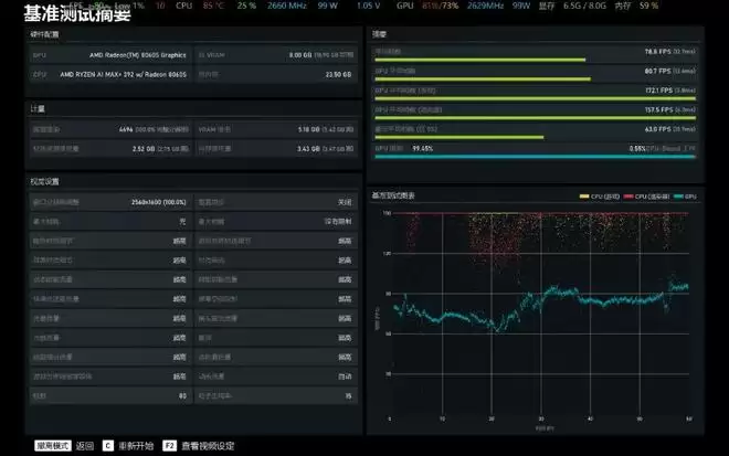 《黑神话:悟空》是当前3A游戏中典型的硬件杀手,在不开启DLSS的情况下,即便是RTX 50系列独显也很难流畅运行,在这款游戏中,我们设置为预设高画质88%采样开启FSR帧生成,最终8060S的平均帧速是61fps,基本达到了流畅的水准。由于RTX独显开启的是DLSS,测试条件不同,因此仅供参考不做对比——100W的RTX 4060 DLSS3 质量是82fps。