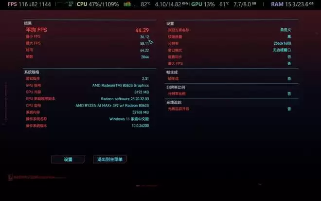 《赛博朋克》2077对显卡性能要求不算低,在2.5K预设超级画质下(关闭各类帧速加成设置),8060S平均帧速44fps;RTX 4060是46fps,8060S稍低一些,但和理论测试成绩接近。