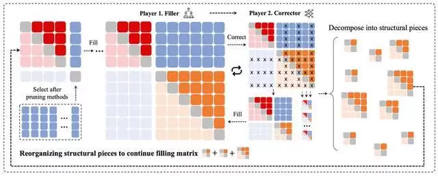 研究团队将高维几何问题转化为余弦矩阵填充问题,并设计了一套多智能体强化学习架构:填充智能体(Player 1)像在棋盘上落子一样,它不断在矩阵中填入数值,相当于在高维空间里摆放球体,快速生成候选结构;修剪智能体(Player 2)负责几何分析,识别不合理的填充,删去次优结构,再把问题交还给Player 1重新优化。