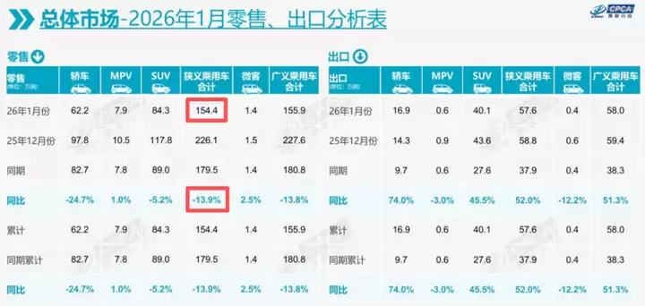 图/2026年1月零售、出口分析表来源/乘联分会 新能源观截图