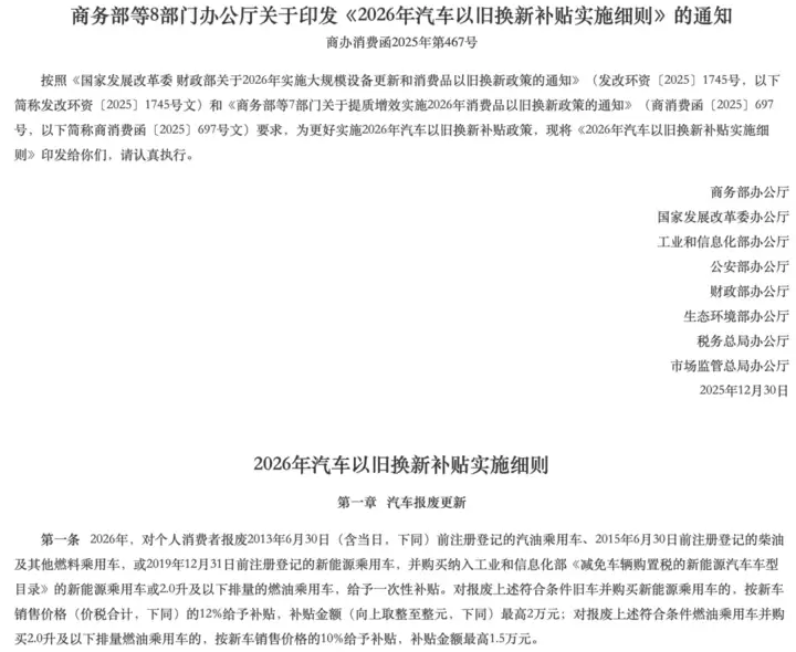 图/《2026年汽车以旧换新补贴实施细则》部分内容来源/互联网 新能源观截图