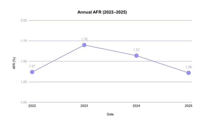 在该企业启动这项统计的第十三个年头,参与统计的全部30个型号均出现故障案例,不过全年来看整体AFR(年化故障率)降至1.30%,创下2024年以来的最低纪录。