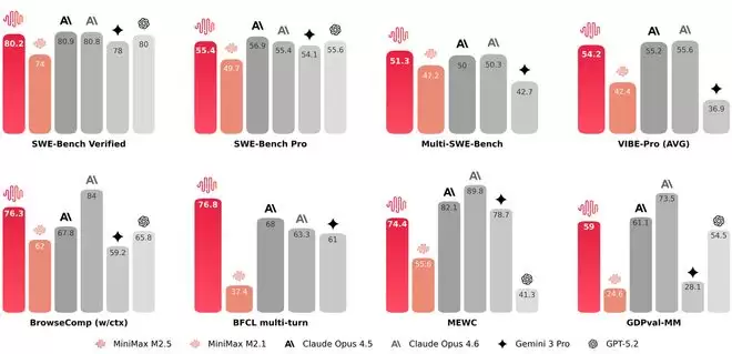 MiniMax M2.5在多项大模型基准测试中的表现。