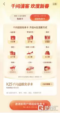 3.新用户打开千问APP,将可直接获得一张25元的超级免单卡,人人都有,活动开启后即可使用。所有用户每邀请一名新朋友下载千问APP,双方可各得一张25元"超级免单卡",最多可得10张。