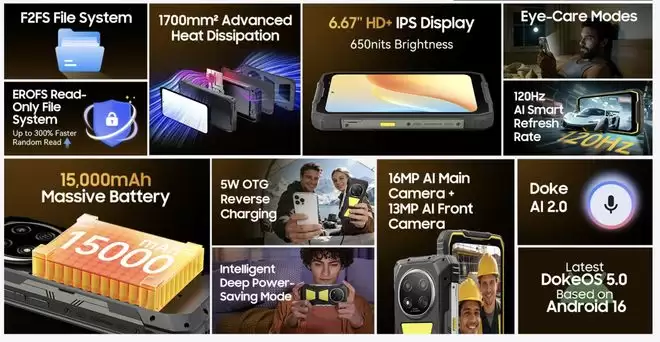 此外,这款手机还搭载1300万像素前置摄像头和1600万像素后置摄像头,支持33W有线快充,预装基于Android 16的DokeOS 5.0操作系统。