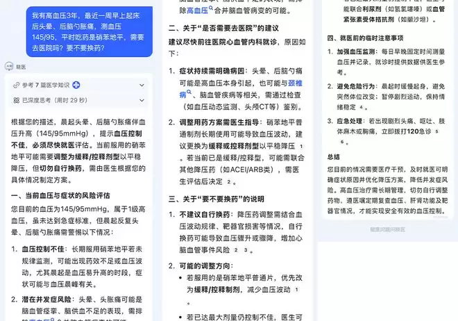 这是我们常见的复杂症状咨询,当遇到多症状、慢性病史叠加的情况,一些医疗助手可能会给出“正确但无用”的笼统建议,如“血压偏高,建议就医”“遵医嘱调整用药”。