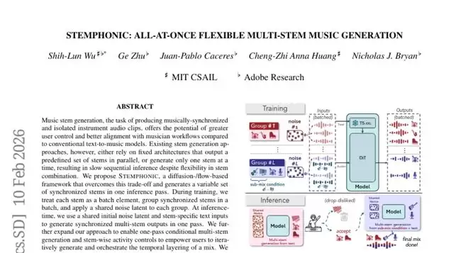 这项由MIT CSAIL与Adobe Research联合开展的研究发表于2026年的计算机声音领域顶级会议,研究编号为arXiv:2602.09891v1。对于想要深入了解技术细节的读者,可以通过这个编号查询完整论文。这个研究团队开发出了一个名为STEMPHONIC的人工智能系统,它能够像一个全能的音乐制作人一样,仅仅根据文字描述就能同时生成多种乐器的音轨,并且这些音轨之间完美同步,仿佛真的有一个乐队在协调演奏。