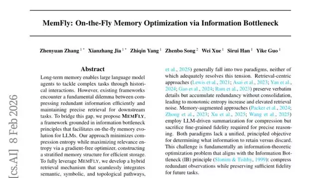 这项由香港科技大学和南京理工大学联合发表于2026年2月的研究论文"MemFly: On-the-Fly Memory Optimization via Information Bottleneck"(论文编号:arXiv:2602.07885v1),为大语言模型代理的记忆管理带来了革命性突破。