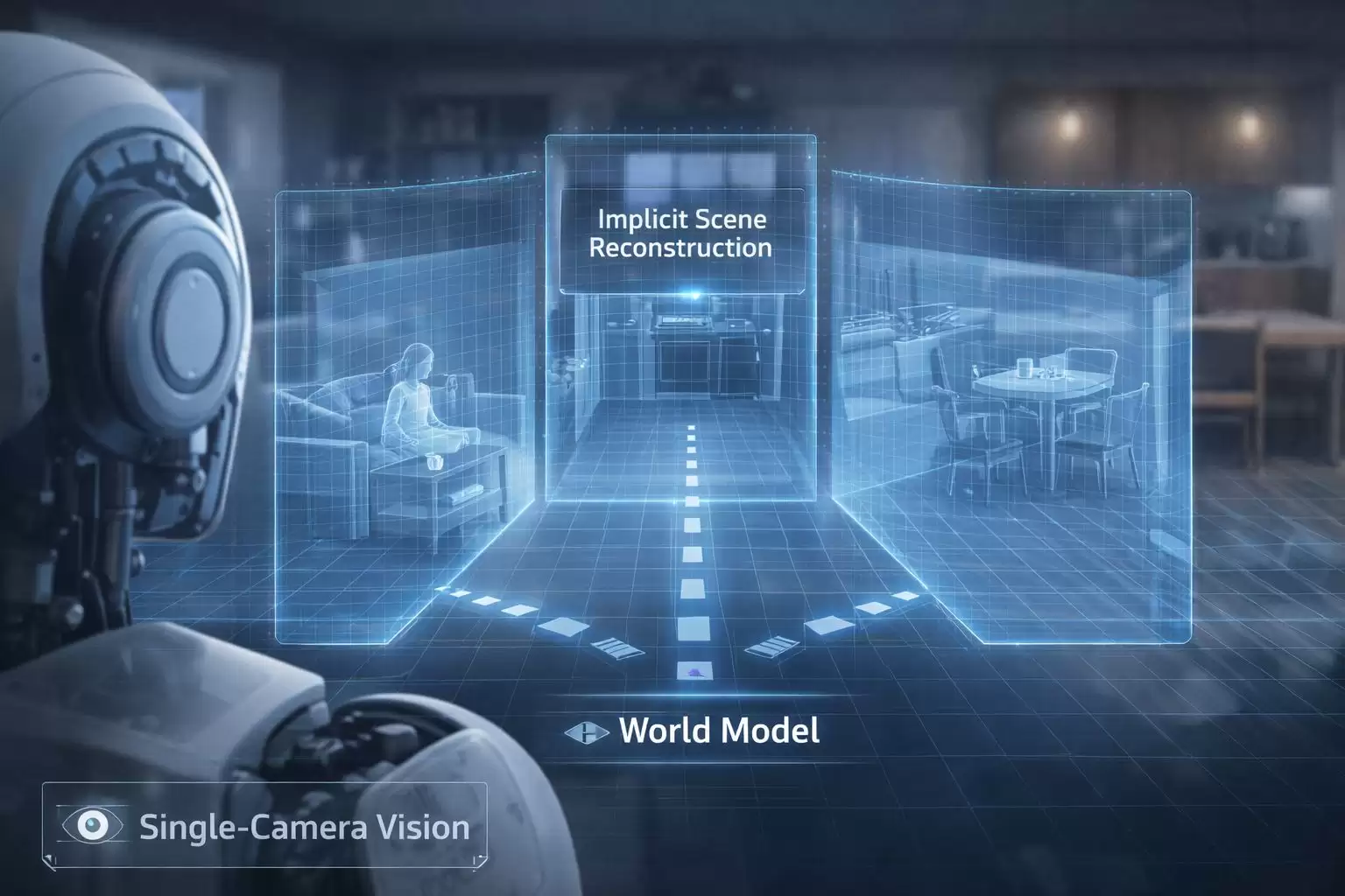 不同于过去依赖显式三维地图构建的传统方案,这类方案的精度高度依赖雷达,且易受反光、透明物体及光照变化干扰;千诀采用因果推理隐式建模,通过单帧图像“幻想”向左、向右、向前行走后可能看到的新场景组件结构特征,能把视觉理解与空间建模融为一体。这一基于世界模型的拟人化范式,有效弥补了传统纯视觉方案信息不充分的短板。