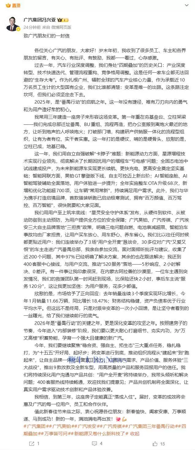 广汽集团董事长冯兴亚近日通过公开信的形式,向合作伙伴及用户系统阐述了企业战略转型进展与未来规划。信中披露,2025年作为“番禺行动”启动元年,广汽集团已完成总部搬迁至番禺、业务单元重组及全流程数字化改造,构建起覆盖研发、生产、供应链、销售及服务的全链条组织架构。