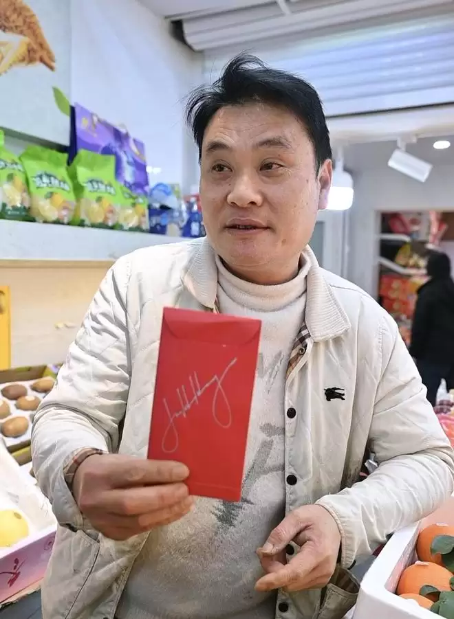 买完水果,黄仁勋送给铁成一个600元的红包,红包正面是一个“黄”字,背面是黄仁勋的英文签名。“其实我到现在也不知道红包上写的是啥。”铁成说,这个红包一直放在店里,有好多人过来想拍个照,“我都随便他们拍。毕竟人家是个大佬嘛。”