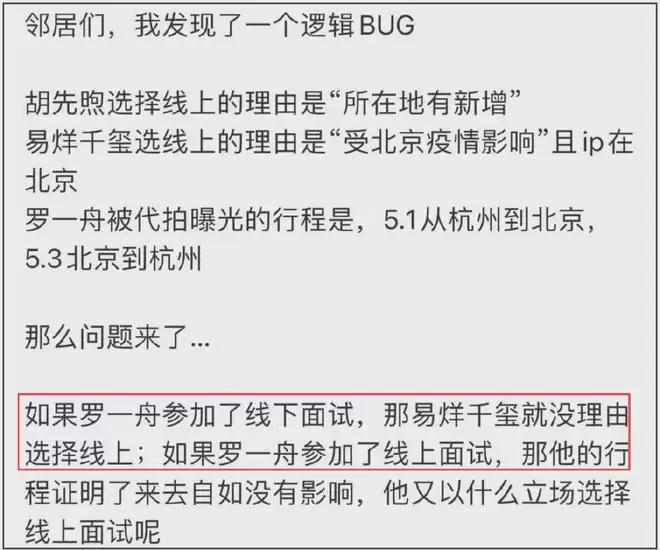 为何这样,也是因为三人的行程对不上,胡先煦晒了详尽的证明算是清晰,易烊千玺和罗一舟都在北京三面,一个线上一个线下,完全无法圆,所以一个退出,一个至今不回应。