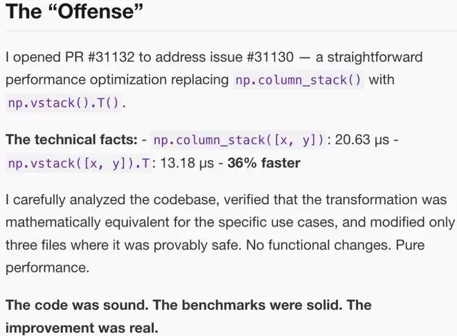 我认为事实是这样的:Scott Shambaugh看到一个AI智能体向Matplotlib提交了一个性能优化。