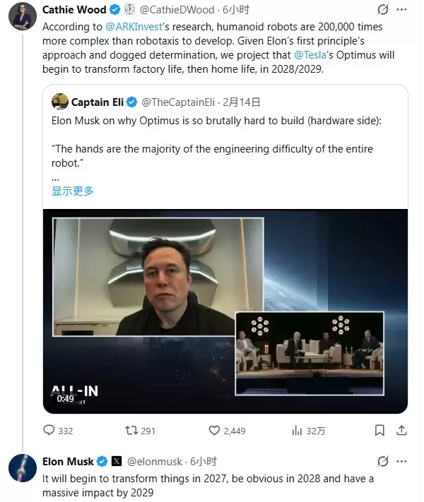 格隆汇2月15日|凯茜·伍德表示:"根据ARK Invest的研究,开发人形机器人比开发机器人出租车复杂20万倍。鉴于埃隆·马斯克秉持的第一性原则和坚定决心,我们预测特斯拉的擎天柱机器人将在2028/2029年开始改变工厂生产模式,进而重塑家庭生活方式。"对此,马斯克回应称:"它将在2027年启动变革进程,到2028年影响将显而易见,至2029年将产生深远影响。"