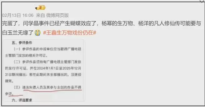 可是,广电有明文规定,“违法失德人员及其参与主创的作品不得参评”。《生万物》在已经播完的情况下,演员爆雷,整部剧也面临着十分为难的局面。如果不将剧中王鑫相关的片段删除的话,那么该剧很有可能无法参与评奖,失去所有评奖机会。