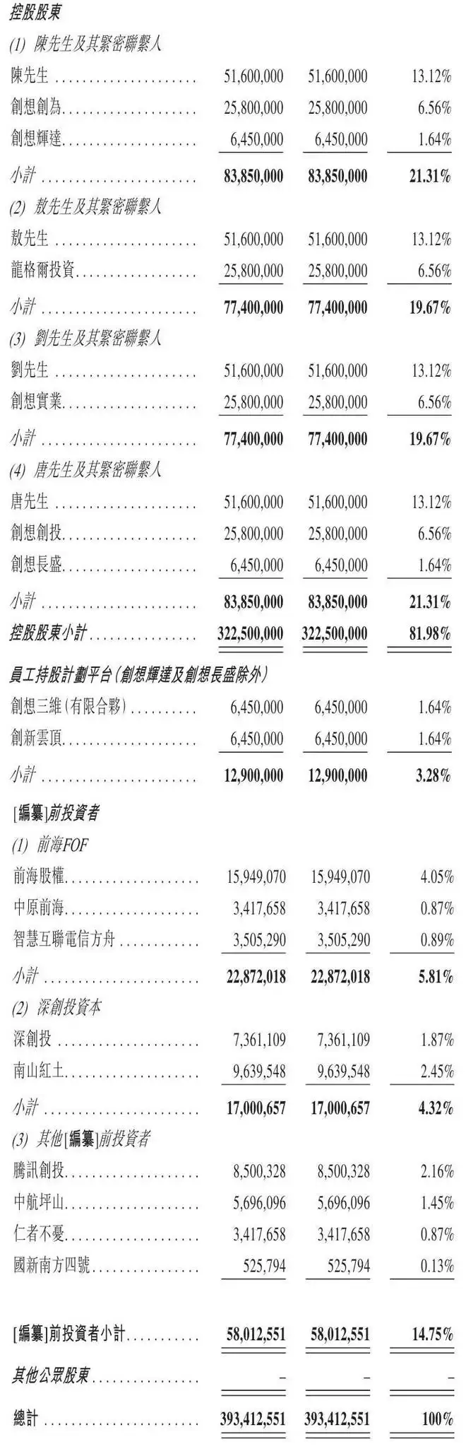 员工持股平台创想三维(有限合伙)和创新云顶分别持股1.64%,合计持股3.28%。
