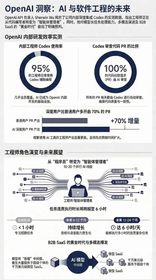 OpenAI API及开发者平台工程负责人Sherwin Wu透露,公司内部95%的工程师已使用Codex编程,且未来12至24个月内,AI模型有望连贯执行长达数小时的复杂任务。