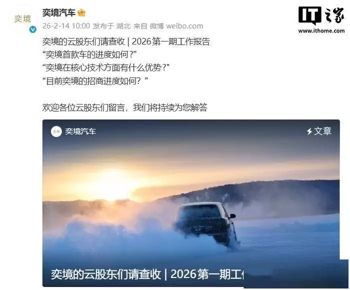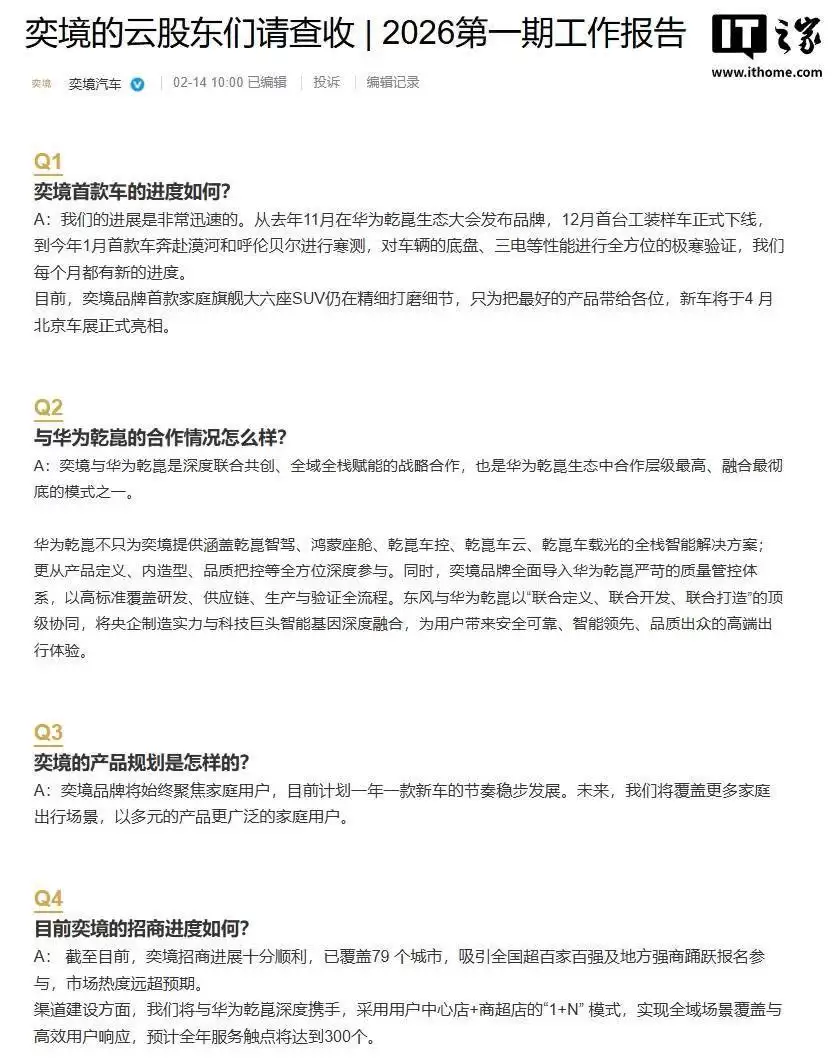 近日,奕境汽车通过官方渠道向其"云股东"发布了2026年首期工作进展报告,详细介绍了首款车型的研发动态、与华为乾崑的战略合作细节、产品布局规划及渠道建设成果。