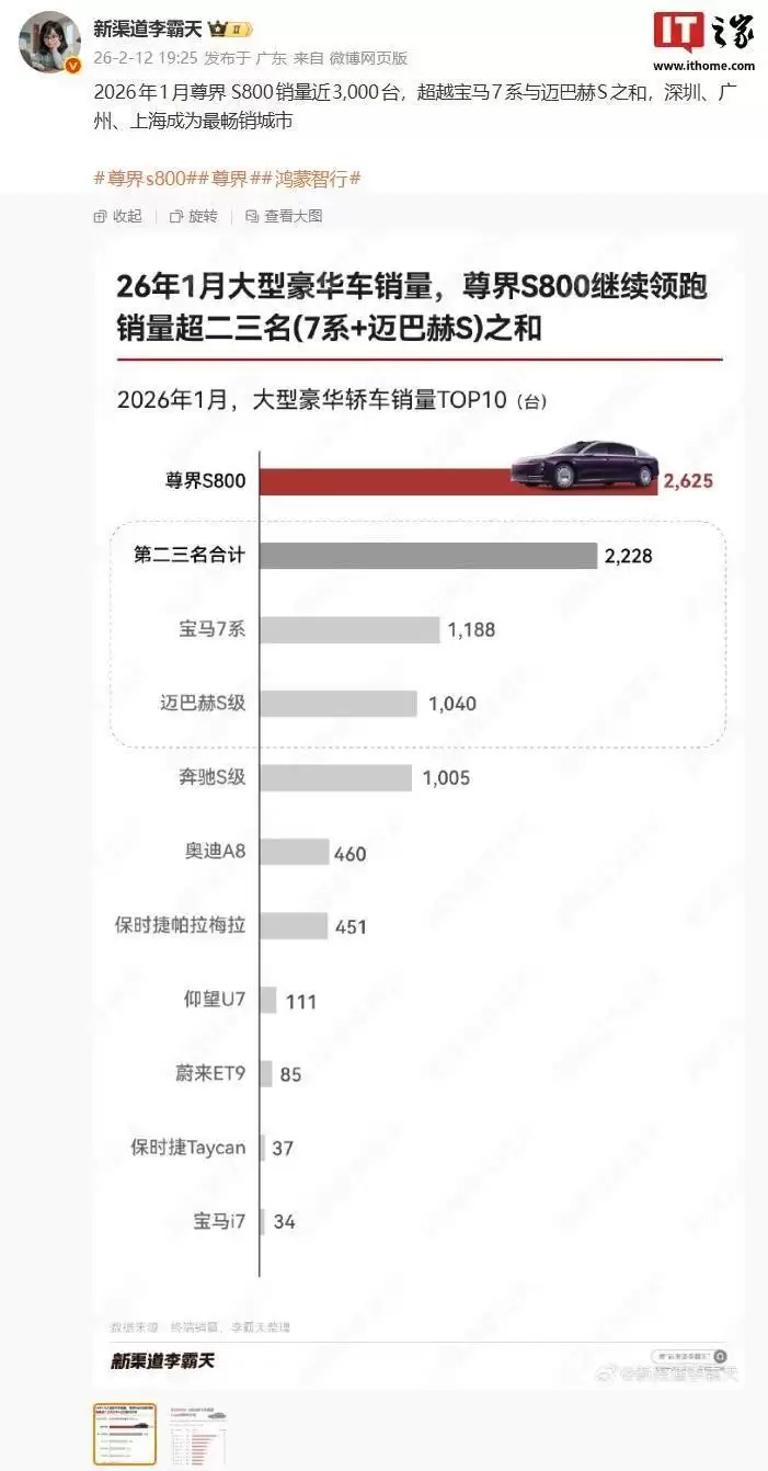 近日,汽车博主@新渠道德霸天公布的一组销售数据引发了行业广泛关注。数据显示,鸿蒙智行旗下尊界S800在2026年1月实现单月销量2625台,不仅稳居大型豪华轿车市场榜首,更以显著优势超越宝马7系与迈巴赫S级销量之和。从区域市场表现来看,深圳、广州、上海三地贡献了主要销量,成为该车型的核心消费市场。