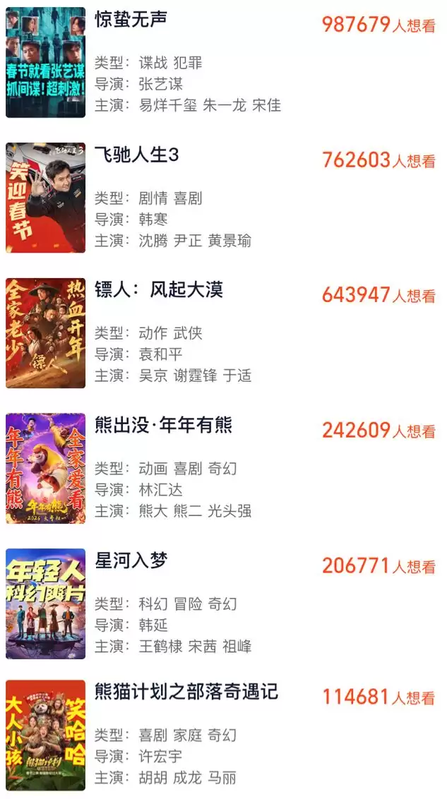 对比往年来看,今年春节档重回多强格局,虽然少了像《哪吒2》那样的超级IP拉动映前关注,但同时也弱化了档期虹吸效应,更利于春节档走向多点开花的局面。基于当前的想看人数、预售票房、排片分布等数据,目前于初一上映的6部影片,已经初步划分出三大梯队。