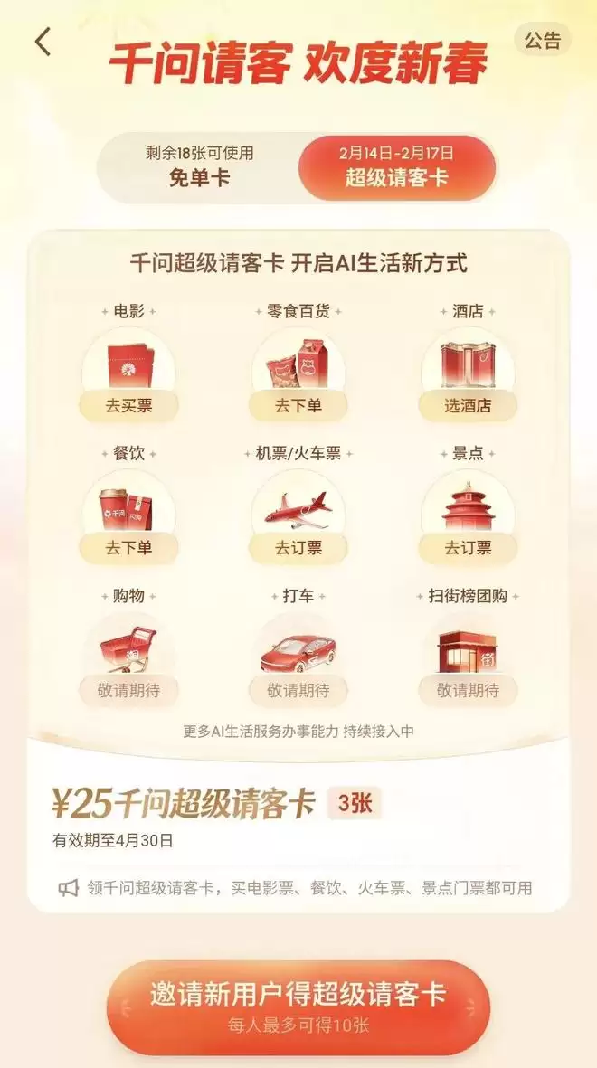 在这样的整体风向下,千问在“请全网喝奶茶”的狂欢之后,迅速于2月14日-2月17日开启新一轮“请客计划”。活动期间,新用户登录千问APP,即可领取“超级请客卡”,用于购买电影票、景点门票、机票、酒店等,直接减免25元。已经享受过免单福利的用户,通过拉新用户也可再次获得“超级请客卡”(使用有效期截至4月30日)。