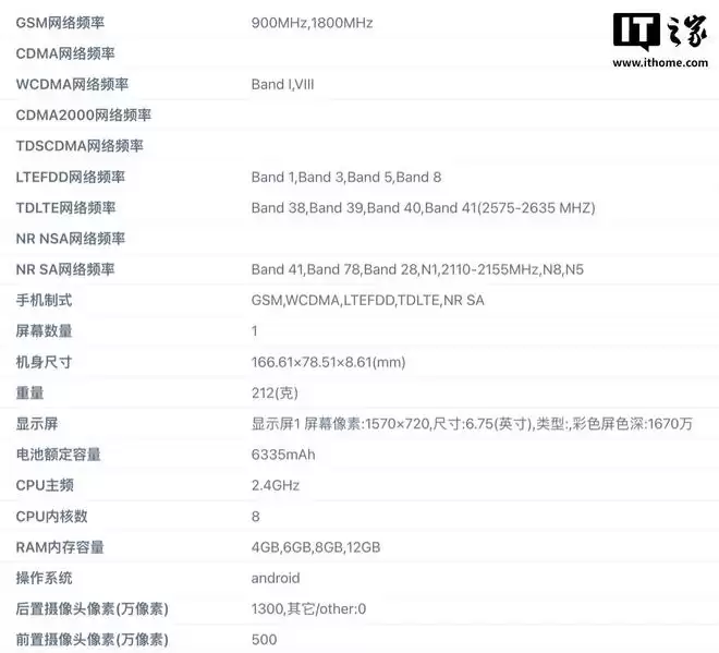 数据库信息显示,这款手机的机身尺寸为166.61*78.51*8.61mm,重量约为212克。它配备了一块6.75英寸的屏幕,分辨率为1520*720,色彩深度达到1670万色。