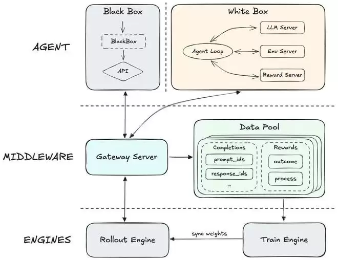 2.中间件抽象层:作为桥梁,该层在物理上将 agent 侧与训练/推理引擎隔离。