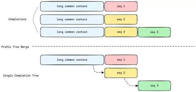 只要共享基础前缀,completions 就能在样本级别合并到一棵前缀树中(即使后续响应或采样分支不同)。