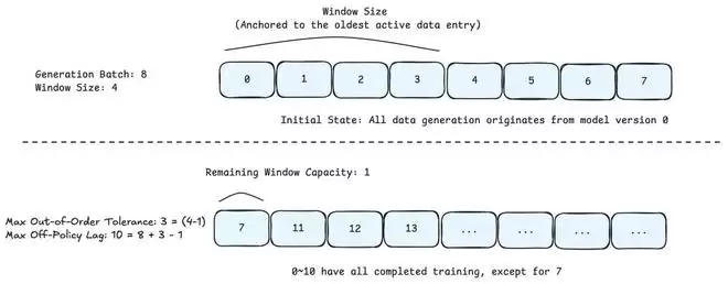 假设当前达到了最大的生成并发量(如 n = 8192),生成队列为 q,当前头部位于索引 h。训练调度器受限于一个大小为w(如 w=4096)的可见窗口: