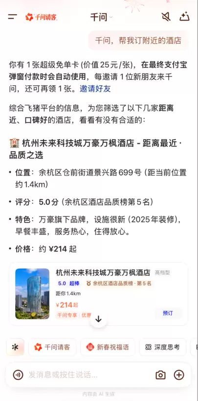 在节日氛围与AI福利的双重加持下,“千问帮我订酒店”功能迅速走红。数据显示,当天县城钟点房的帮下单订单量激增约300%。此次推出的“超级请客卡”每张价值25元,使用场景更广泛,覆盖餐饮、年货、电影票、酒店、机票及景区门票等。例如,用户只需在千问中说一句“帮我订一家附近的酒店”,千问就会自动完成筛选,用户确认信息后即可在端内一键支付,全程无需跳转。
