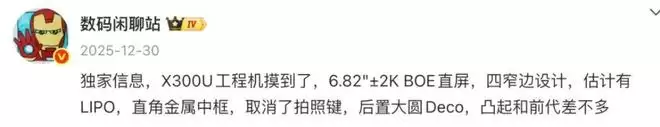 另外,博主@数码闲聊站 的一份爆料中提到,“独家信息,X300U工程机摸到了,6.82"±2K BOE直屏,四窄边设计,估计有LIPO,直角金属中框,取消了拍照键,后置大圆Deco,凸起和前代差不多”。
