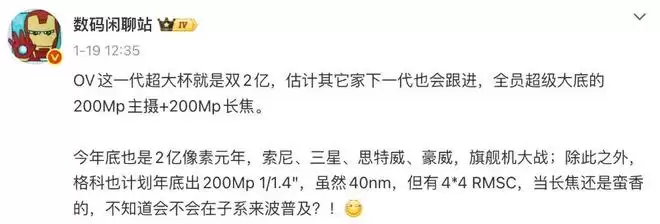 在此之前,博主@数码闲聊站 曾在爆料中提到过,OPPO和vivo这一代超大杯就是双2亿,估计其它家下一代也会跟进,全员超级大底的200Mp主摄+200Mp长焦。